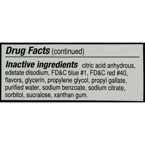 Inactive Ingredients: Citric Acid Anhydrous, Edetate Disodium, FD&C Blue #1, FD&C Red #40, Flavors, Glycerin, Propylene Glycol, Propyl Gallate, Purified Water, Sodium Benzoate, Sodium Citrate, Sorbitol, Sucralose, Xanthan Gum