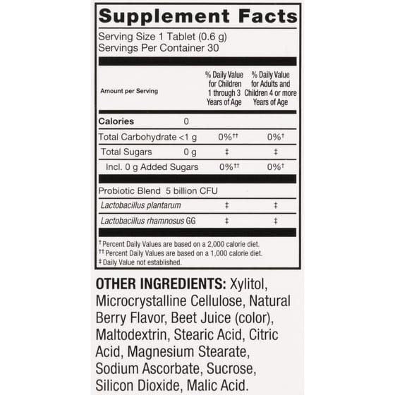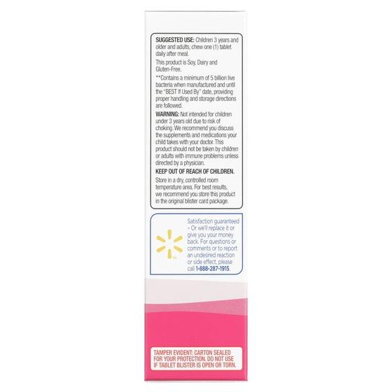 Help keep your children healthy with Equate Children's Probiotic Dietary Supplement Tablets. Probiotics are beneficial bacteria that help promote a healthy intestinal microflora. This dietary supplement can help to maintain the balance of good bacteria in the digestive system, while supporting a healthy immune system.* Each tablet contains 5 billion active cultures of Lactobacillus rhamnosus GG, one of the most studied probiotic strains. When taken daily, this formula works naturally with your child's body to help maintain the natural balance of good bacteria in the digestive system and helps support immune health.* Supplement your child's healthy diet with Equate Children's Probiotic Tablets.