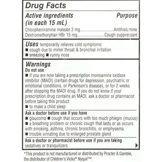 Parents and caregivers can be prepared when a child's cold hits with Equate Children's Multi-Symptom Nighttime Cough and Cold Liquid. Our nighttime formula is sugar free, aspirin- and acetaminophen-free, and includes chlorpheniramine maleate, an antihistamine, and dextromethorphan, a cough suppressant. These ingredients temporarily relieve common cold and flu symptoms like sneezing, runny nose, and cough to help your child get to sleep. Take home Equate Children's Multi-Symptom Nighttime Cough and Cold Liquid and help soothe your little one's symptoms.