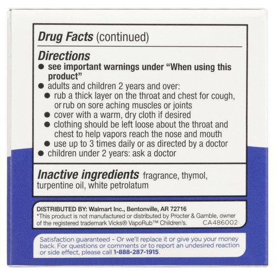 If your little one is suffering from a cough or sore and aching muscles, try Equate Children's Vaporizing Rub Ointment for Children two years and older. Our ointment is formulated to temporarily relieve cough due to minor throat and bronchial irritation associated with a cold and relieve minor aches and pains of muscles and joints. Just rub a thick layer on the throat and chest for cough or rub on sore aching muscles for joints. Say goodbye to your little one's fuss with Equate Children's Vaporizing Rub Ointment for Children.
