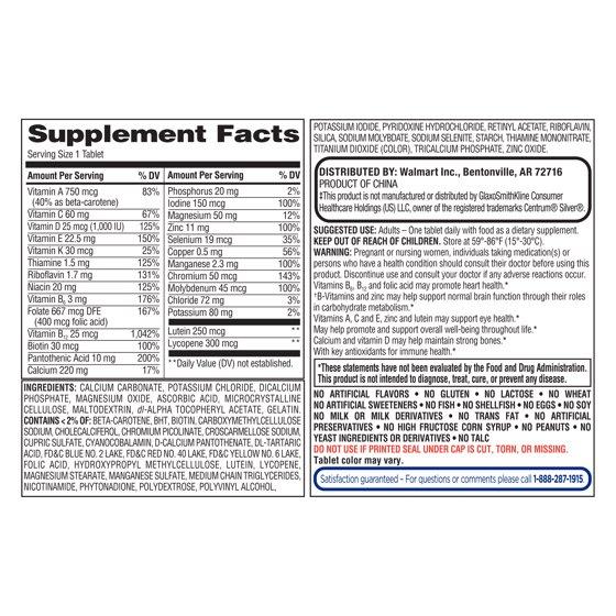 - **This product is not manufactured or distributed by GlaxoSmithKline Consumer Healthcare Holdings (US) LLC, owner of the registered trademarks Centrum® Silver®.