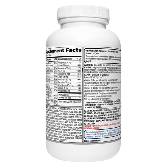 Choose Equate Complete Multivitamin Tablets, Adults 50+ for a blend of vitamins and minerals specially formulated to promote overall health and comprehensive nutritional support for adults over 50.* They deliver key nutrients including vitamins A, D, and K, with calcium, lutein, and lycopene to help protect the health of your heart, eyes, and bones.* They also contain vitamins C and E, with riboflavin and niacin to promote healthy body structure and B vitamins and zinc to support normal brain function throughout life.* With antioxidants to support immune system function and B vitamins to sustain energy levels, this heart-healthy supplement is uniquely balanced for adults over 50.* They contain no gluten, iron, lactose, or artificial flavors. Support your whole-body health with Equate Complete Multivitamin/Multimineral Supplement Tablets, Adults 50+, a carefully crafted and complete dietary supplement for active adults.*