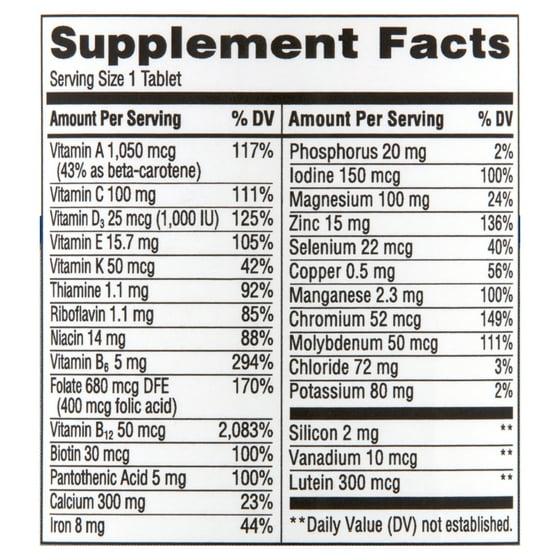 Calcium Carbonate, Magnesium Oxide, Potassium Chloride, Ascorbic Acid, Dicalcium Phosphate, Microcrystalline Cellulose, Maltodextrin, Starch, dl-Alpha Tocopheryl Acetate. Contains < 2% Of: Beta-Carotene, BHT, Biotin, Carboxymethylcellulose Sodium, Cholecalciferol, Chromium Picolinate, Croscarmellose Sodium, Cupric Sulfate, Cyanocobalamin, D-Calcium Pantothenate, dl-Tartaric Acid, FD&C Blue No. 2 Lake, FD&C Red No. 40 Lake, FD&C Yellow No. 6 Lake, Ferrous Fumarate, Folic Acid, Hydroxypropyl Methylcellulose, Lutein, Magnesium Stearate, Manganese Sulfate, Medium Chain Triglycerides, Nicotinamide, Phytonadione, Polydextrose, Polyvinyl Alcohol, Potassium Iodide, Pyridoxine Hydrochloride, Retinyl Acetate, Riboflavin, Silica, Sodium Molybdate, Sodium Selenite, Thiamine Mononitrate, Titanium Dioxide (color), Tricalcium Phosphate, Zinc Oxide.