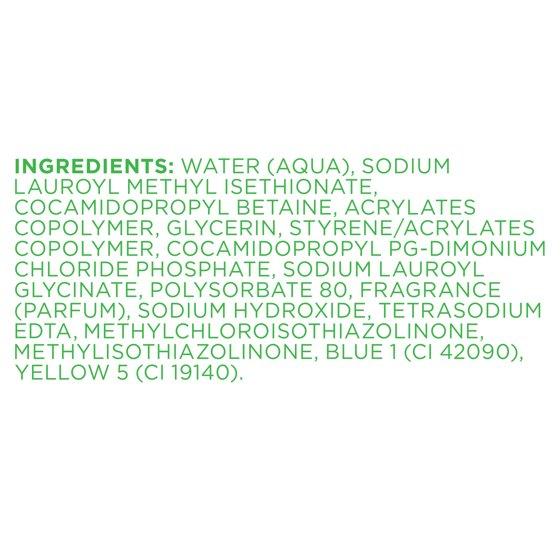 Water (Aqua), Sodium Lauroyl Isethionate, Cocamidopropyl Betaine, Acrylates Copolymer, Glycerin, Styrene/Acrylates Copolymer, Cocamindopropyl PG-Dimonium Chloride Phosphate, Sodium Cocoyl Glycinate, Polysorbate 80, Fragrance (Parfum), Sodium Hydroxide, Tetrasodium EDTA, Methylchloroisothiazolinone, Methylisothiazolinone, Blue 1 (CI 42090), Yellow 5 (CI 19140)