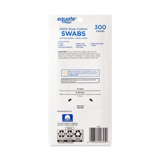 Keep your vanity or medicine kit well stocked with this 300-count pack of Equate Cotton Swabs. This product is made with 100-percent cotton. It is gentle and safe for a wide variety of uses for the home, baby care, healthcare and more. These plastic cotton swabs are of hygienic quality.