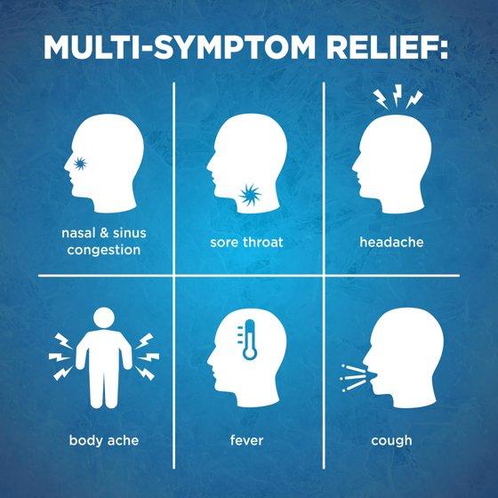 - Relieves nasal and sinus congestion, sore throat, cough, headache, body ache and fever