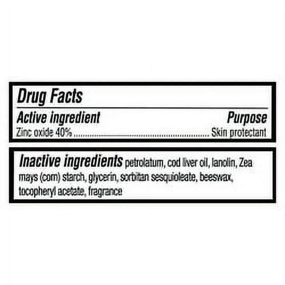 Active Ingredient: Zinc Oxide. Inactive Ingredients: Petrolatum, Cod Liver Oil, Lanolin, Zea Mays (Corn) Starch, Glycerin, Sorbitan Sesquioleate, Beeswax, Tocopheryl Acetate, Fragrance