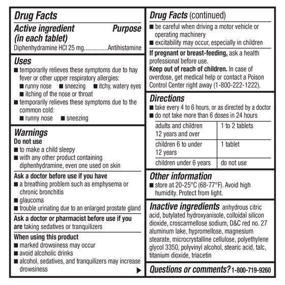 - Antihistamine: Each 25 mg tablet provides powerful relief from cold and allergy symptoms for 4-6 hours
