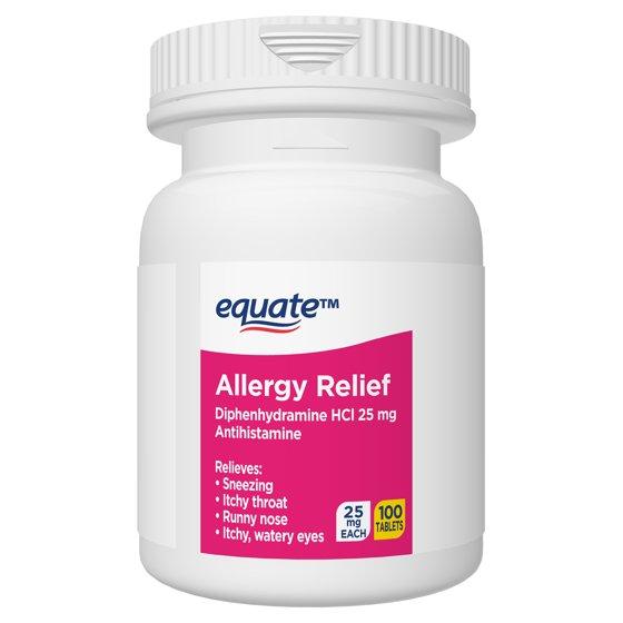 Equate Diphenhydramine HCl 25 mg Antihistamine Complete Allergy Tablet, 100 Count