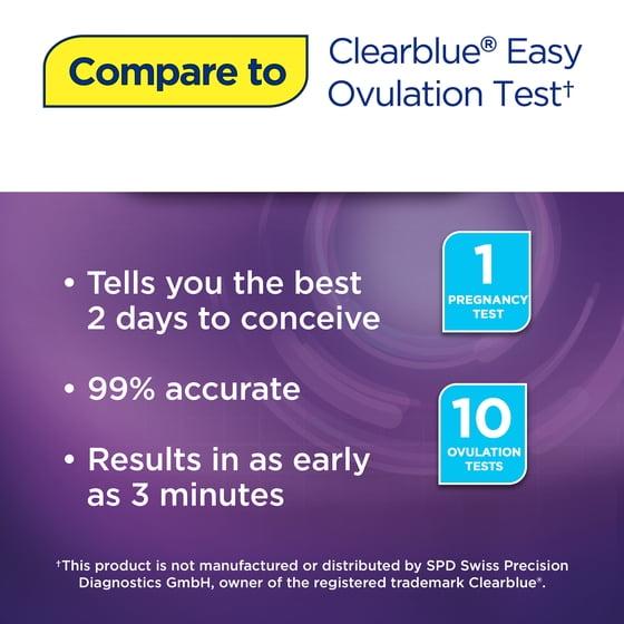 Equate Early Ovulation Test helps you identify your two most fertile days with 99% accuracy, making it easier to plan for conception. This kit includes 10 ovulation tests and 1 pregnancy test, giving you the tools you need to track your cycle and confirm results. With clear, easy-to-read results in as little as 3 minutes, Equate Early Ovulation Test provides fast, reliable insight into your body’s timing. Equate Early Ovulation Test is a convenient and accurate choice for your fertility journey.