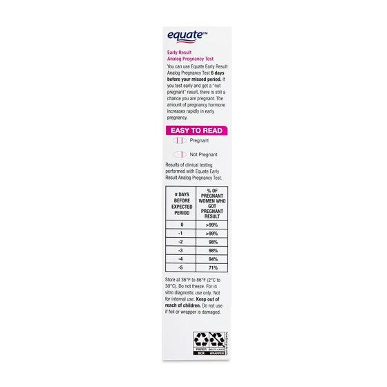 Early Results Analog Pregnancy test, 2 count. Compare to First Response. Results in just 3 minutes. Provides early detection of the pregnancy hormone. You can use Equate Early Results Digital Pregnancy Test 6 days from your missed period to start. If you test early and get a "not pregnant" result, there is still a chance you are pregnant. The amount of pregnancy hormone increases rapidly in early pregnancy. Over 99% accurate at detecting typical pregnancy hormone levels. However, some women by not have detectable amounts of pregnancy hormones in their urine on the first day of the missed period or may have miscalculated the first day of the period. The US Surgeon General advises pregnant women to abstain from alcohol consumption, as this may lead to harmful effects on the baby. Do not use a test that is past its expiration date. This pregnancy test is for home use.