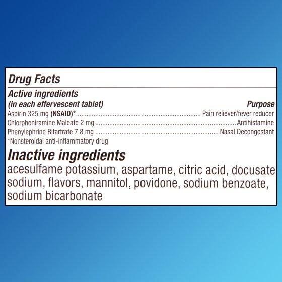 Active Ingredient (in Each Effervescent Tablet): Aspirin (325 mg) NSAID (Nonsteroidal Anti-Inflammatory Drug), Chlorpheniramine Maleate (2 mg), Phenylephrine Bitartrate (7.8 mg). Inactive Ingredients: Acesulfame Potassium, Aspartame, Citric Acid, Docusate Sodium, Flavors, Mannitol, Povidone, Sodium Benzoate, Sodium Bicarbonate.