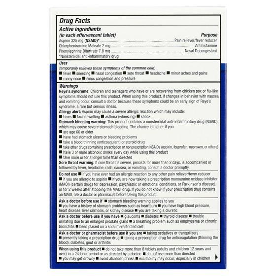 - Active ingredients (in each effervescent tablet): Aspirin 325 mg (pain reliever/fever reducer), Chlorpheniramine Maleate 2 mg (Antihistamine), Phenylephrine Bitartrate 7.8mg (nasal decongestant)