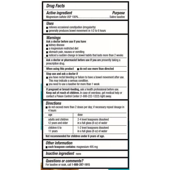 - Active ingredient: Magnesium Sulfate USP 100% - Saline laxative