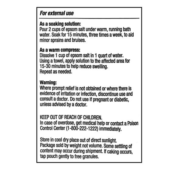 For Internal Use: Do not exceed more than 2 doses per day; if necessary, repeat dosage in 4 hours; For adults and children 12 years and older take 2-4 level teaspoons dissolved in a full glass (8 oz) of water; Children 6 to 11 years take 1-2 level teaspoons dissolved in a full glass (8 oz) of water; Not recommended for children under 6 years of age.; For External Use: As a soaking solution: Pour 2 cups of epsom salt under warm, running bath water. Soak for 15 minutes, three times a week, to aid minor sprains and bruises.; As a warm compress: Dissolve 1 cup of epsom salt in 1 quart of water. Using a towel, apply solution to the affected area for 15-30 minutes to help reduce swelling. Repeat as needed.