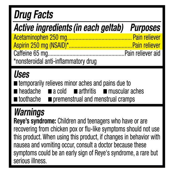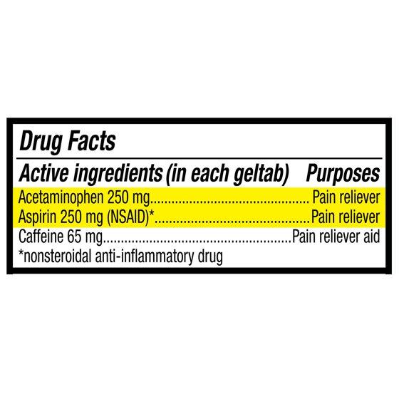 - Active ingredients (in each geltab): Acetaminophen 250 mg (pain reliever), Aspirin 250 mg (NSAID) (pain reliever), Caffeine 65 mg (pain reliever aid)