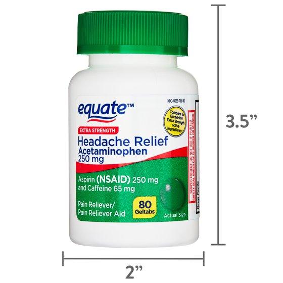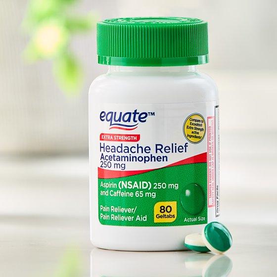 Manage your aches with Equate Extra Strength Headache Relief Geltabs. Equate Extra Strength Headache Relief Geltabs temporarily relieve minor aches and pains due to a headache, cold, arthritis, toothache, muscular aches, and premenstrual and menstrual cramps. Each of these fast-acting geltabs is formulated with 250 milligrams of Acetaminophen, 250 milligrams of Aspirin, a nonsteroidal anti-inflammatory, and 65 milligrams of caffeine to give you the headache relief you need to get back to your day. These geltabs are for adults and children 12 years of age and older. Fight back against aches and pains with Equate Extra Strength Headache Relief Geltabs.