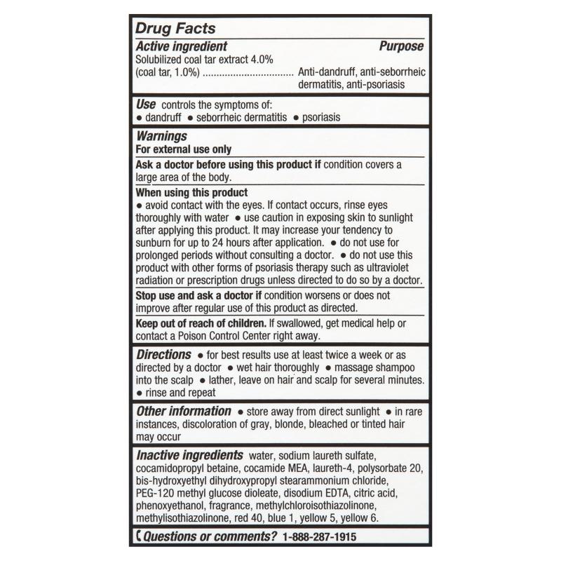 Active Ingredient: Coal Tar 1% (4% Neutar® Solubilized Coal Tar Extract). Inactive Ingredients: Water, sodium laureth sulfate, polysorbate 20, cocamidopropyl betaine, bishydroxyethyl dihydroxypropyl stearammonium chloride, fragrance, cocamide MEA, PEG-120 methyl glucose dioleate, DMDM hydantoin, tetrasodium EDTA, sodium hydroxide, citric acid, sodium chloride, triethanolamine.
