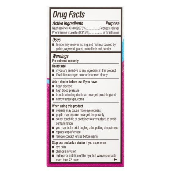 Active Ingredients: Naphazoline Hci (0.03%) Purpose Redness Reliever, Pheniramine Maleate (0.32%) Purpose Antihistamine. Inactive Ingredients Benzalkonium Chloride (0.01%), Boric Acid, Edetate Disodium (0.1%), Hypromellose, Purified Water, Sodium Borate, Sodium Chloride.