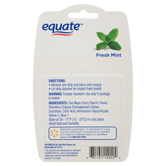 Get fresh breath in an instant with Equate Sugar Free Fresh Mint Breath Strips. These five packs of 24 strips each will save you from embarrassing bad breath whenever and wherever you need it. Simply remove one strip from the pack and place it onto your tongue until dissolved to experience minty fresh breath. These strips are formulated without sugar and have a fresh mint flavor that makes your mouth feel clean and reinvigorated. Keep one in every location with this convenient set of five packs: in your pocket, backpack, purse, car, work desk, and any other easily-accessible location, so you're always only seconds away from minty-fresh breath. Use these especially after odor-inducing foods or beverages such as coffee or garlic-heavy dishes. Take a pack in your pocket to use on date night so that you will feel confident about getting up close and personal. Pop a strip in your mouth before an interview or an important business meeting to make the best impression. Never be without the instant cool mint remedy of Equate Sugar Free Fresh Mint Breath Strips.