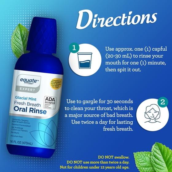 Instantly freshen your breath and attack those germs that cause bad breath with Equate Fresh Breath Oral Rinse. It contains no alcohol so your mouth won't experience a burning sensation. Using regularly will help with bleeding gums, gingivitis, plaque and tarter buildup, and bad breath, to give your mouth an overall cleaning. For best results do not exceed use more than twice a day. This mouthwash is not recommended for children under 12 years of age. Add Equate Fresh Breath Oral Rinse to your morning and night oral care routine.