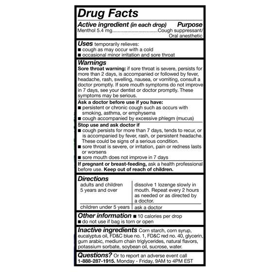 Menthol, corn starch, corn syrup, eucalyptus oil, FD&C blue no. 1, FD&C red no. 40, glycerin, gum arabic, medium chain triglycerides, natural flavors, potassium sorbate, soybean oil, sucrose, water