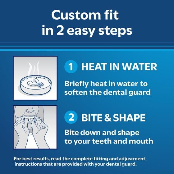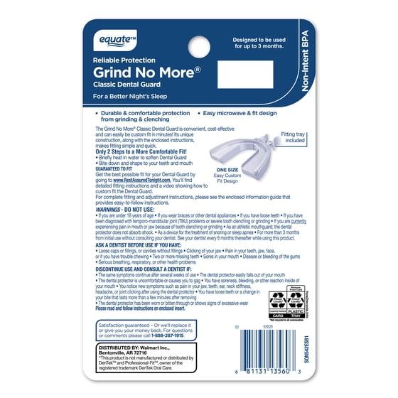 For a better night's sleep, rely on Equate Rest Assured Classic Dental Guards. Compare to Dentek Professional-Fit Dental Guard - Maximum Protection. These durable and comfortable dental guards provide protection from bruxism, more commonly known as teeth grinding and clenching. When you use these mouth guards for sleeping, you get the convenience and ease of a reliable night guard for teeth grinding. The "microwave and fit" design is a quick way to customize each dental night guard in minutes and ensure it fits perfectly. A storage case is included to help keep each dental guard clean, easier to find, and perfect for travel. Relief is only minutes away. For a better night’s sleep, get Equate Rest Assured Classic Dental Guards.