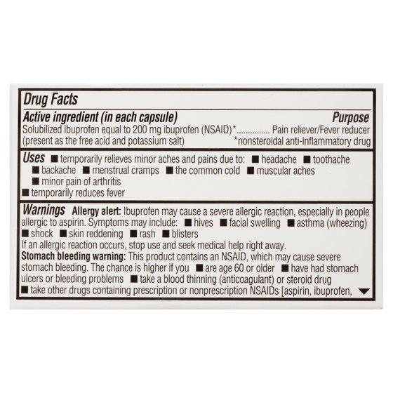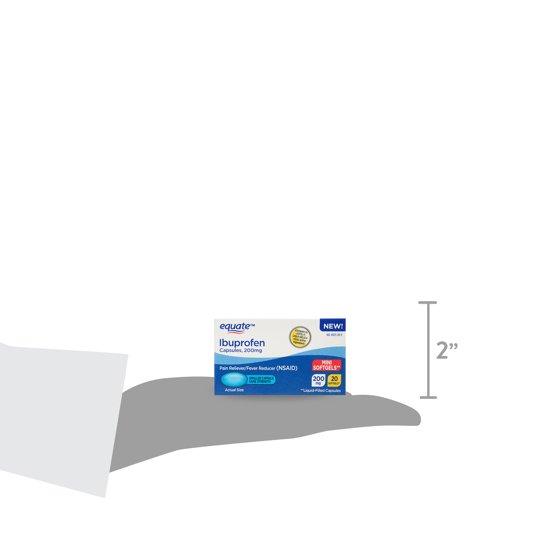 Get the pain relief you need from Equate Ibuprofen Mini Softgels. Take one tablet every four hours to six hours when you need relief from pain caused by minor pain of arthritis, headache, muscle pain, toothache, backache, and menstrual pain. You can take it when you are sick to bring down your fever and keep aches and pains away. This bottle contains 20 capsules at 200 milligrams of ibuprofen each. Keep it in your medicine cabinet, car, or your desk at work, so you can have it within reach whenever you need it. Pick up Equate Ibuprofen Mini Softgels today to get the relief you deserve.