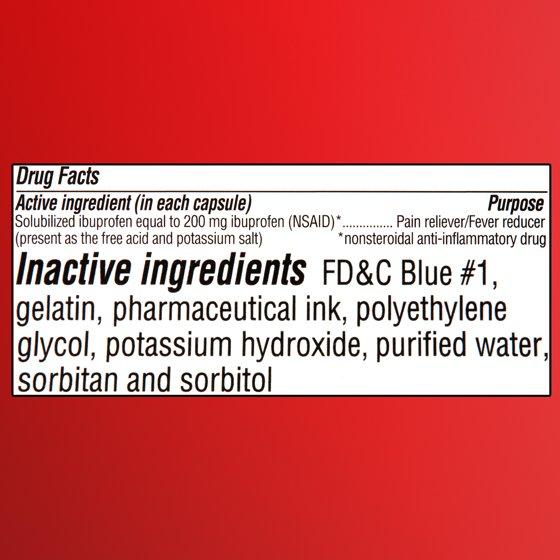 Solubilized ibuprofen equal to 200 mg ibuprofen (NSAID),Pain reliever/Fever reducer (present as the free acid and potassium salt) , *nonsteroidal anti-inflammatory drug.
