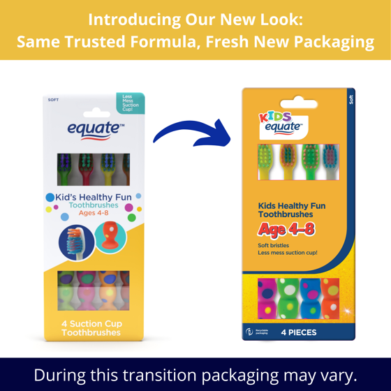Equate Kids Healthy Fun Toothbrushes for Ages 4 to 8 with Suction Cup, Soft Bristles (4 Count)