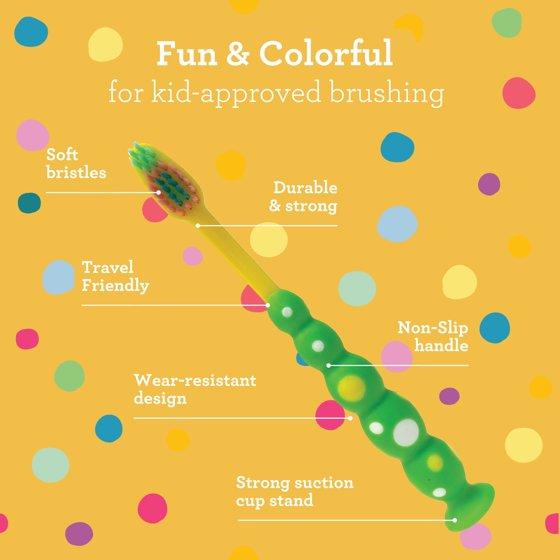 - MESS-FREE WITH THE SUCTION CUP: Added suction cup base adds a playful touch to your child's toothbrush, while providing a convenient storage solution that helps keep the bristles clean and free from harmful substances. With its ability to stand upright on countertops or sinks, its a mess-free oral care solution for your child.