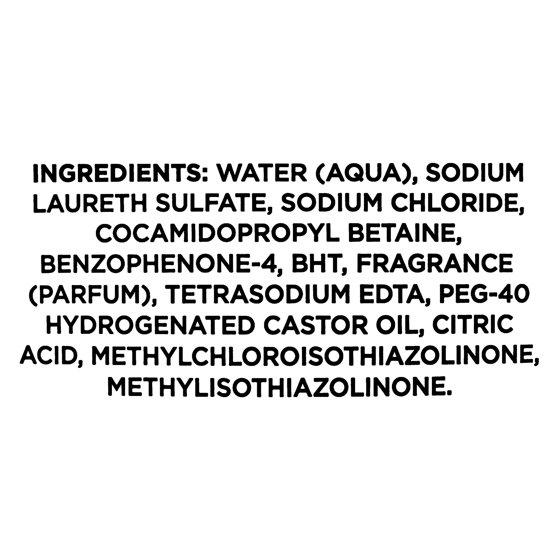 Water (Aqua), Sodium Laureth Sulfate, Sodium Chloride, Cocamidopropyl Betaine, Benzophenone-4, Fragrance (Parfum), Tetrasodium EDTA, PEG-40 Hydrogenated Castor Oil, Citric Acid, Methylchloroisothiazolinone, Methylisothiazolinone