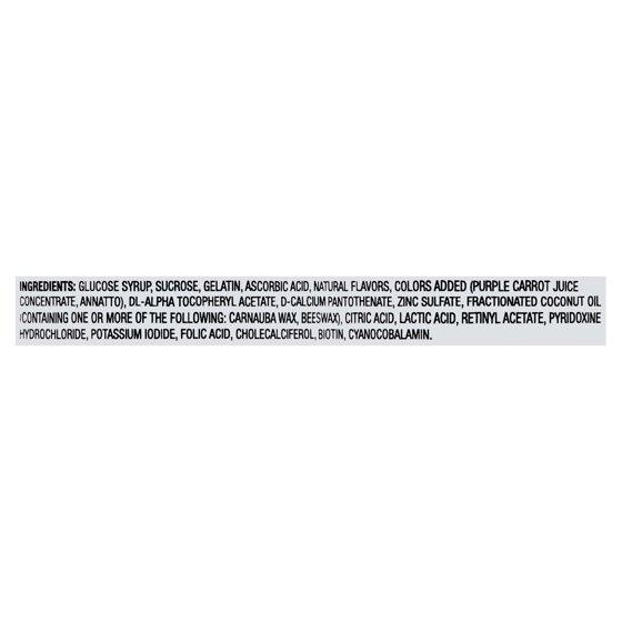 Glucose Syrup, Sucrose, Gelatin, Ascorbic Acid, D-Calcium Pantothenate, DL-Alpha Tocopheryl Acetate, Colors Added (Black Carrot Juice Concentrate, Maqui Berry Juice Concentrate, Annatto), Natural Flavors, Zinc Sulfate, Fractionated Coconut Oil (Containing one or more of the following: Carnauba Wax, Beeswax), Citric Acid, Lactic Acid, Pyridoxine Hydrochloride, Retinyl Acetate, Folic Acid, Biotin, Cholecalciferol, Potassium Iodide, Cyanocobalamin.