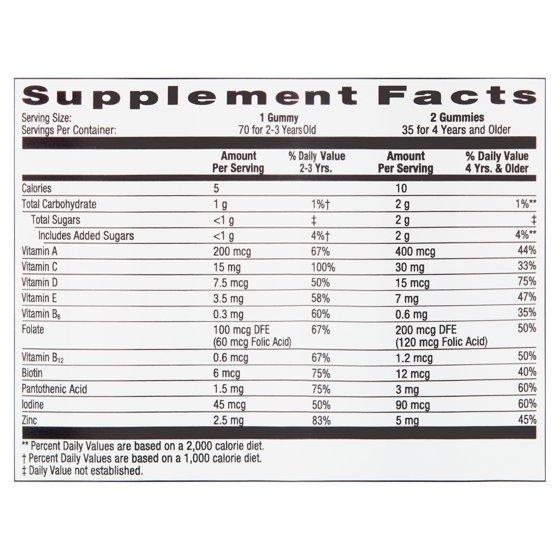 Glucose Syrup, Sucrose, Gelatin, Ascorbic Acid, D-Calcium Pantothenate, Dl-Alpha Tocopheryl Acetate, Colors Added (Black Carrot Juice Concentrate, Maqui Berry Juice Concentrate, Annatto), Natural Flavors, Zinc Sulfate, Fractionated Coconut Oil (Containing One Or More of The Following: Carnauba Wax, Beeswax), Citric Acid, Lactic Acid, Pyridoxine Hydrochloride, Retinyl Acetate, Folic Acid, Biotin, Cholecalciferol, Potassium Iodide, Cyanocobalamin.