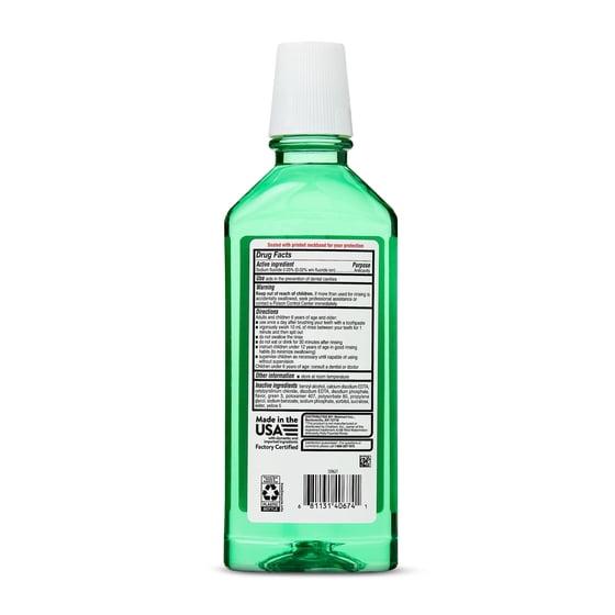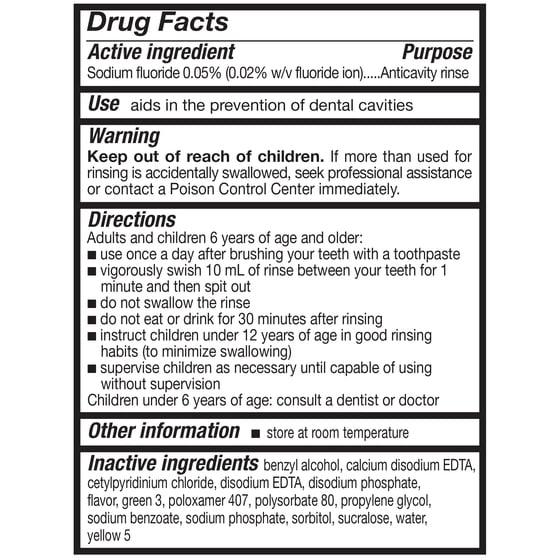 Active ingredient: Sodium fluoride 0.05% (0.02% w/v fluoride ion) Inactive ingredients: benzyl alcohol, calcium disodium EDTA, cetylpyridinium chloride, disodium EDTA, disodium phosphate, flavor, green 3, poloxamer 407, polysorbate 80, propylene glycol, sodium benzoate, sodium phosphate, sorbitol, sucralose, water, yellow 5