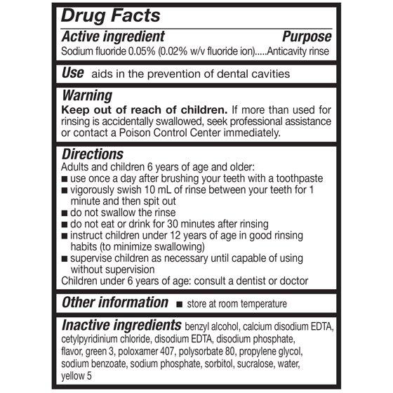 Active ingredient: Sodium fluoride 0.05% (0.02% w/v fluoride ion) Inactive ingredients: benzyl alcohol, calcium disodium EDTA, cetylpyridinium chloride, disodium EDTA, disodium phosphate, flavor, green 3, poloxamer 407, polysorbate 80, propylene glycol, sodium benzoate, sodium phosphate, sorbitol, sucralose, water, yellow 5
