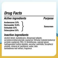 Avobenzone, Homosalate, octisalate, octocrylene, Alcohol Denat., Isododecane, Diisopropyl Adipate, Acrylates/Octylacrylamide Copolymer, VA/Butylmaleate/Isobomyl Acrylate Copolymer, PEG-12 Dimethicone, Caprylyl Glycol, Hydrogenated Methyl Abietate, Ascorbyl Palmitate, Tocopheryl Acetate, Mineral Oil, Panthenol, Water, Aloe Barbadensis Leaf Extract, Fragrance