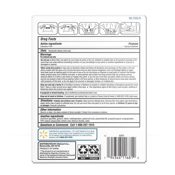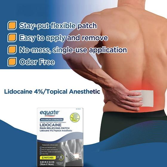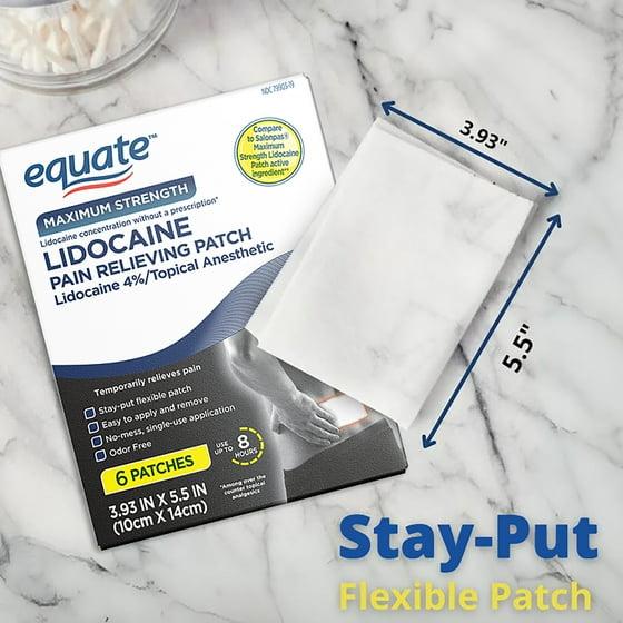 Our Equate Maximum Strength Lidocaine Pain Relieving Patches help relieve pain for up to 8 hours. With targeted pain relief, our odor-free medicated patches will temporarily relieve minor body aches and pain when you need it most using four percent of the active ingredient, Lidocaine. The patches' no-mess, single-use application offers effortless convenience while the flexible stay-put design helps each patch to stay intact throughout your daily activities. Get the comfort you want and the pain relief you need with our Equate Lidocaine Pain Relieving Patches. Making the right health decisions can be challenging. With a complete range of products and simple solutions, Equate allows you to take care of your family with confidence. Compare to Salonpas® Lidocaine Patch Active Ingredient.
