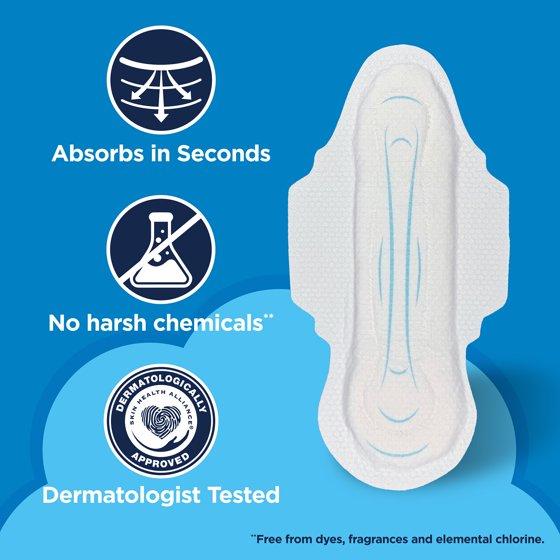 Experience ultimate comfort and worry-free protection with Equate Overnight Maxi Pads with Flexi-Wings. Designed to absorb in seconds, these pads feature a 100% breathable backsheet* for freshness and a soft embossed cover for skin health, earning them dermatological approval from the Skin Health Alliance. Conveniently individually wrapped for discreet access in your purse or gym bag, they're perfect for postpartum needs or nightly use with 45% greater back coverage than size one. Available in sizes one to five to suit your flow, choose Equate Overnight Maxi Pads with Flexi-Wings for a fresh, comfortable, and worry-free experience.