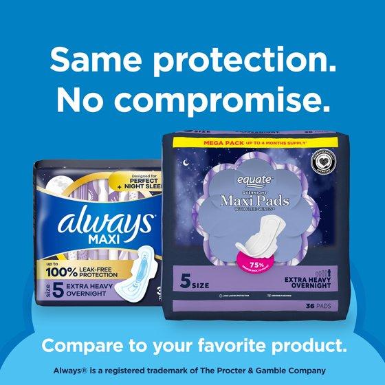 Equate Maxi Pads with Wings, Size 5, Extra Heavy Overnight Absorbency, Compare to Always® (36 Count)