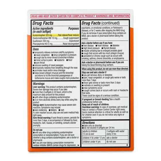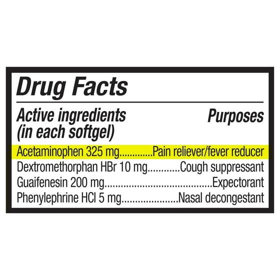 Active Ingredients: Acetaminophen 325 mg(Pain reliever/fever reducer), Dextromethorphan HBr 10 mg(Cough suppressant), Guaifenesin 200 mg(Expectorant), Phenylephrine HCl 5 mg(Nasal decongestant), Inactive ingredients: FD&C Yellow No. 6, gelatin, glycerin, polyethylene glycol, povidone, propylene glycol, sorbitol sorbitan solution, titanium dioxide