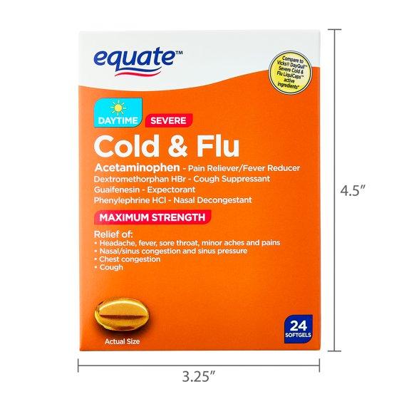 Equate Maximum Strength Non Drowsy Daytime Severe Cold & Flu Softgels, 325mg, 24 Count. Power through cold and flu season with Equate Maximum Strength Daytime Cold & Flu Softgels. Each softgel is made with a powerful combination of ingredients to relieve headaches, fever, sore throat, nasal and chest congestion, cough, and body aches. The formula also helps loosen mucus and phlegm, making coughs more productive and breathing easier. With 24 non-drowsy softgels per box, you’ll have the relief you need to stay on your feet and feel better fast. Trust Equate for effective, affordable care you can rely on. For adult use.