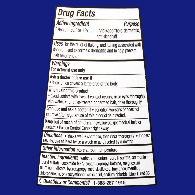 Active Ingredients: Selenium Sulfide (1 %), Anti-Seborrheic Dermatitis, Anti-Dandruff. Inactive Ingredients: Water, Ammonium Laureth Sulfate, Ammonium Lauryl Sulfate, Cocamide MEA, Cocamidopropyl Betaine, Magnesium Aluminum Silicate, Hydroxypropyl Methylcellulose, Fragrance, Menthol, Chlorphenesin, Phenoxyethanol, Citric Acid, Sodium Chloride, Blue 1, Red 33.