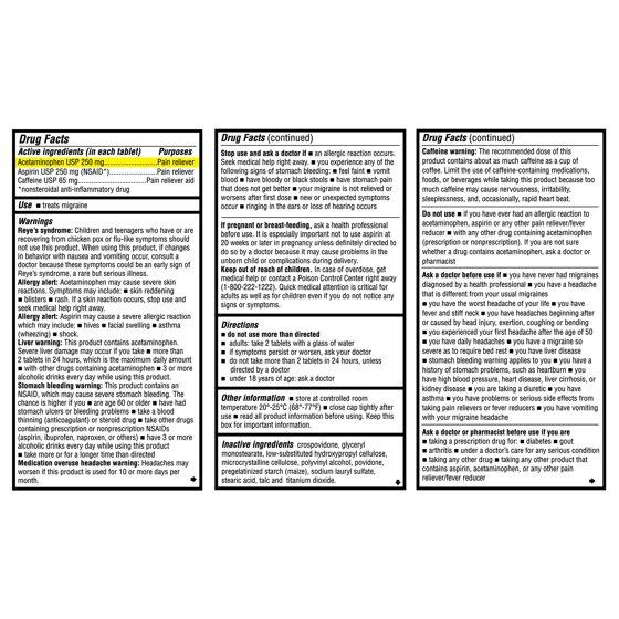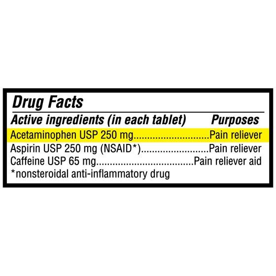 - Formulated with acetaminophen, aspirin, and caffeine