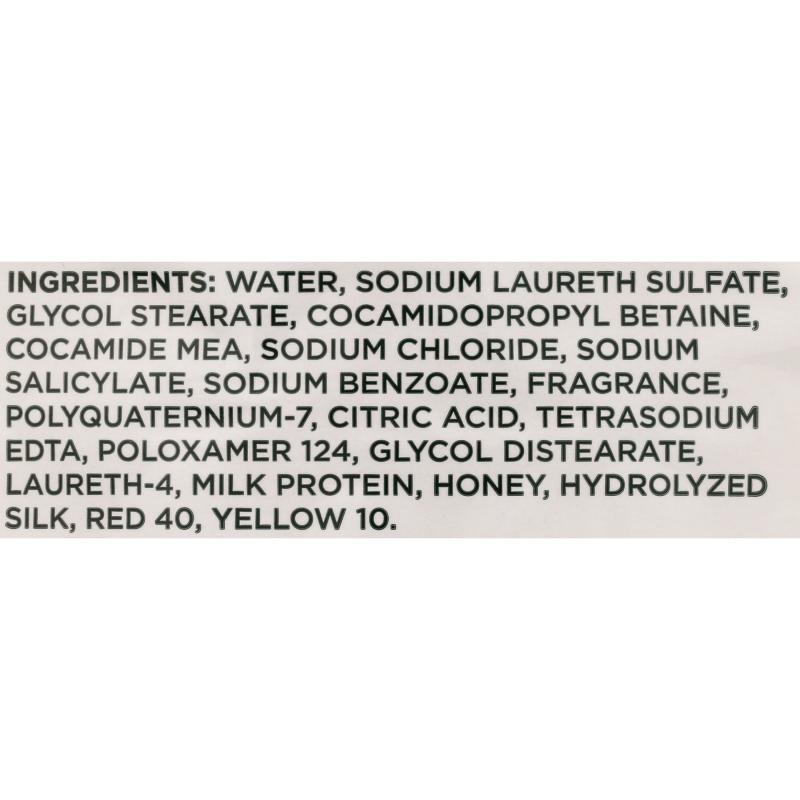 water, sodium laureth sulfate, glycol stearate, cocamidopropyl betaine, cocamide MEA, sodium chloride, sodium salicylate, sodium benzoate, fragrance, polyquaternium-7, citric acid, tetrasodium EDTA, poloxamer 124, glycol distearate, laureth-4, milk protein, honey, hydrolyzed silk, red 40, yellow 10