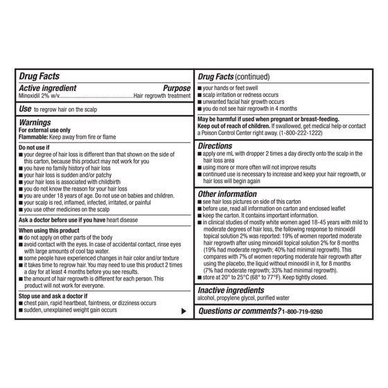 Active ingredient: Minoxidil 2% w/v. Inactive ingredients: alcohol, propylene glycol, purified water.