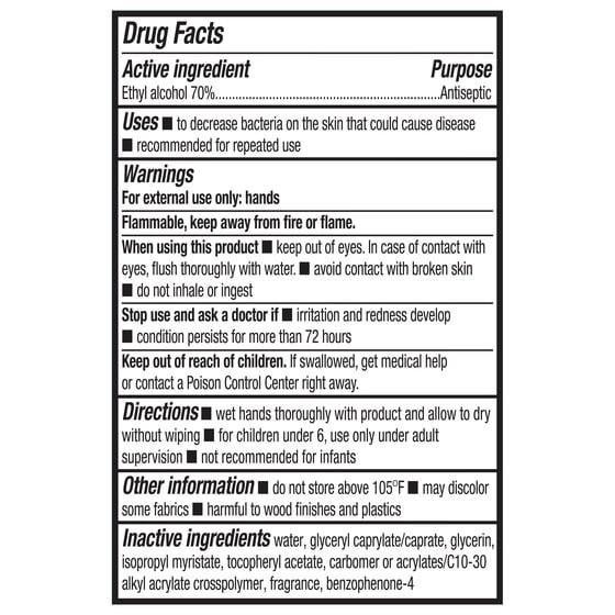Active ingredient: Ethyl alcohol (70%) Inactive Ingredients: water, glyceryl caprylate/caprate, glycerin, isopropyl myristate, tocopheryl acetate, carbomer or acrylates/C10-30 alkyl acrylate crosspolymer, fragrance, benzophene-4