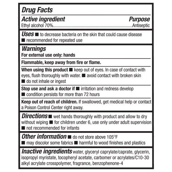 Active ingredient: Ethyl alcohol (70%) Inactive Ingredients: water, glyceryl caprylate/caprate, glycerin, isopropyl myristate, tocopheryl acetate, carbomer or acrylates/C10-30 alkyl acrylate crosspolymer, fragrance, benzophene-4
