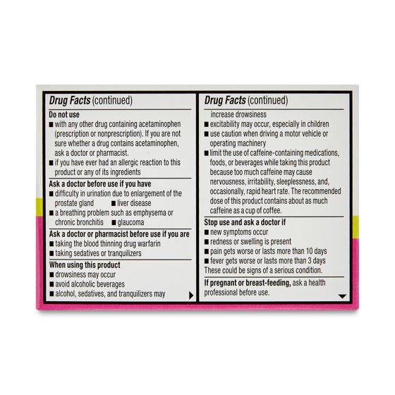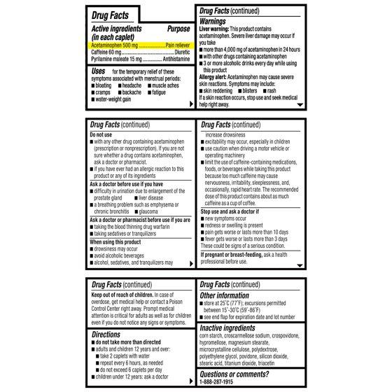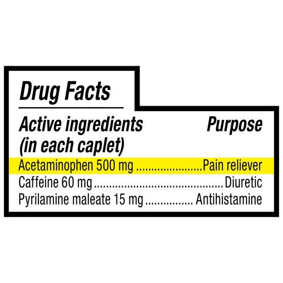 - Active ingredients (in each caplet): Acetaminophen 500mg (pain reliever), Caffeine 60mg (diuretic), Pyrilamine Maleate 15mg (antihistamine)