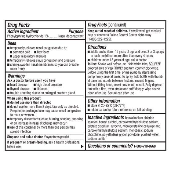 - Fast-acting nasal spray with Phenylephrine HCl 1% for quick sinus and nasal congestion relief.